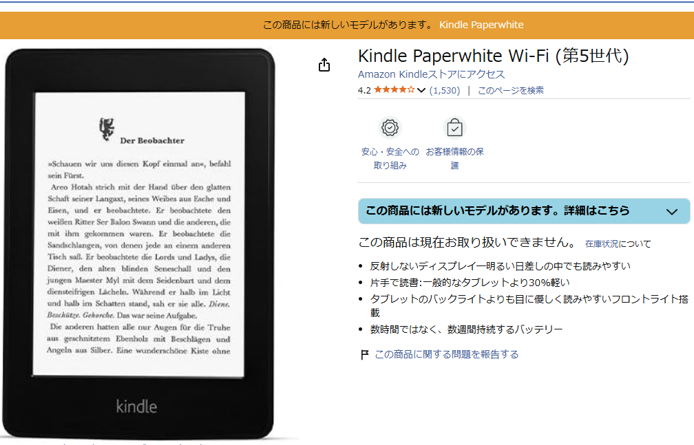 かなり分かりづらいけど、調べたらこの【第五世代】っていうのはPaperwhiteの第5世代ではなく、Kindleシリーズ全体の第5世代の時期に出たPaperwhiteという意味らしい。Paperwhiteの第一世代。